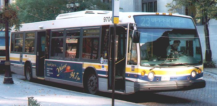 9704 was a 1997 NovaBus LFS, shown waiting for passengers at Gore Park on Oct. 20, 2003. Unlike most Ontario transit systems, the HSR orders its buses with the wheelchair ramp at the centre door instead of at the front door. |