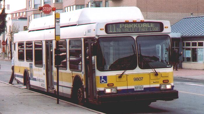 9807 is a 1998 New Flyer C40LF, seen laying up at the Burlington bus terminal on Oct. 20, 2003. This photo clearly shows the centre doors positioned one window forward, an option not often seen on these buses. |
