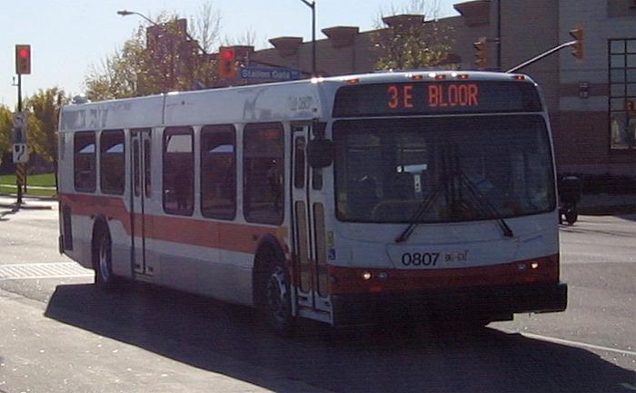 0807 is a 2008 New Flyer D40LFR, spotted on Rathburn Road West near the Square One Shopping Centre on Oct. 9, 2008. |