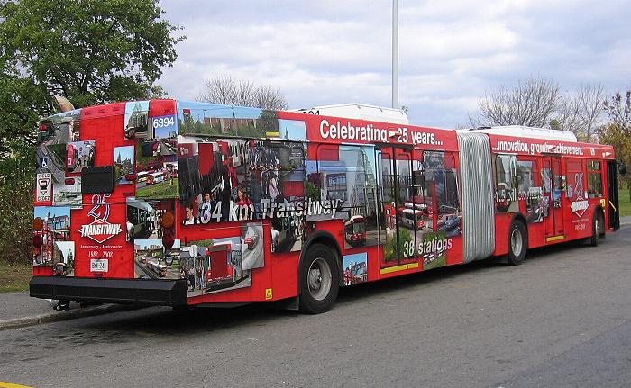 6394 is shown in a special full-body wrap commemorating the 25th anniversary of the Transitway opening in 1983. The bus was nearly brand new at the time and is shown on display at a press conference at Lincoln Fields Station on Oct. 27, 2008. |