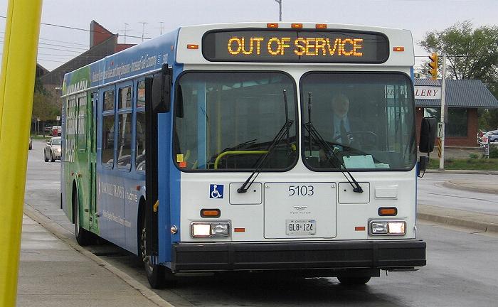 5104 is another 2005 NFI D40LF, shown waiting to resume service at the Oakville GO station on Oct. 15, 2007. These buses were the first low-floor buses purchased new from New Flyer, and the first NFI buses Oakville has put into service since acquiring the former Owen Sound buses in 1998. |